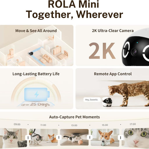 ROLA Mini 2K Camera Robot: Movable Pet Camera with Phone App, Indoor Cam w/One-Touch Call, 2-Way Talk, Night Vision, Motion Detection, Video Recording